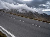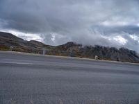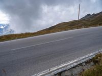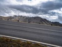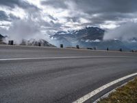 A curvy thoroughfare of asphalt winds through the picturesque highland terrain of Austria, Europe. Dramatic clouds and cumulus fill the sky, while trees, grass and vegetation create a peaceful rural landscape. A lake and street light can be seen in the distance, framed by the grey mountain landforms and plain bank of the road surface.