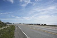 A lone stretch of highway, winding through a coastal highland landscape, curves toward the horizon. The road surface is smooth and the sky overhead is filled with the contrails of passing aircraft, as the sun sets over the Pacific Coast Highway.