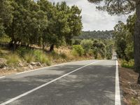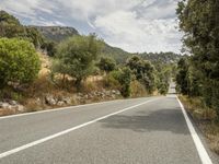 The highway leading to Mallorca in the Balearic Islands, Spain, is lined with trees and grass, creating a beautiful landscape. The yellow tar road surface extends straight down the road, framed by a clear blue sky.