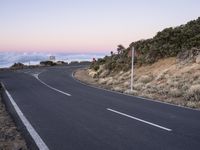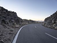 an empty winding road on a mountain with the sun set above the mountains in the background