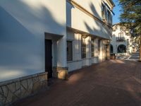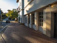 A beautiful building with historic architecture stands tall on a tree-lined street in the USA on a clear sky day, casting hard shadows.