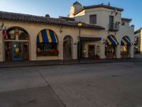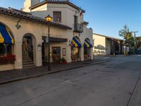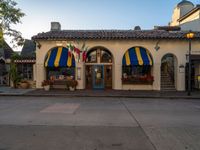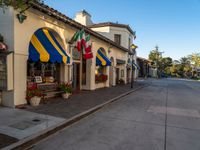 A charming tree-lined street with historic architecture and storefronts in the USA on a sunny day.