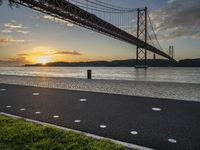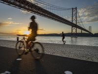 As the sun rises on the horizon, a bicyclist rides along the coastal road in Lisbon, Portugal. The harbor, lake, and ocean can be seen in the background, while the asphalt road surface, vegetation, tree, and infrastructure provide a foreground. The afterglow of the sun is visible and its warm light illuminates the jetty, the pier, the bike tire, and the bike rider, making it a stunning break of day.