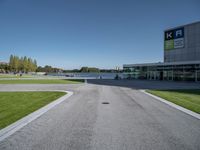 an intersection in the middle of an empty lot on a bright, sunny day with the windows of a large modern building reflecting the sky