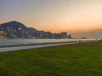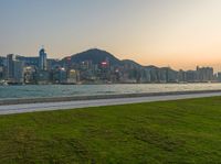 A stunning view of Hong Kong city skyline at dawn, with the sun visible on the horizon, showcasing the urban design and towering skyscrapers against a clear sky.