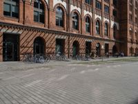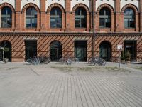 bicycles lined up in front of two brick building in germany, with red brick, round, arched, arched, and arched windows