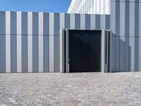 A modern composite material building with a facade of concrete, asphalt, cobble stone, wood and other materials, located in the business district of Bremen, Germany. The combination of lines, rectangles, shades and tints create a unique pattern in the clear sky of dawn.
