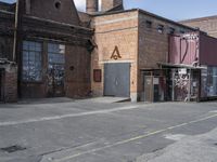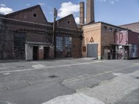 an industrial city street and brick buildings with graffiti painted all over it's walls