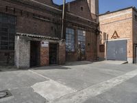 A clear day in Berlin, Germany showcases the city's industrial and urban design features in this alley-way, with brick, concrete, glass, metal, and wood materials forming the facade of this factory and warehouse complex in the residential area.