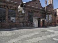 a large old brick building with windows on the side of it's sides and a big, broken clock hanging in front of the door