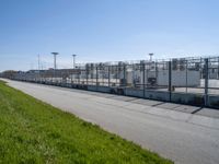 A view of the rolling stock, asphalt road surface, overhead power lines, and other industrial infrastructure of Bremerhafen, Germany, on a clear day. The landscape is populated with chain-link fencing, public utility poles, street lights, transmission towers, and trees, with a container port and factory in the background.