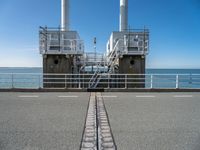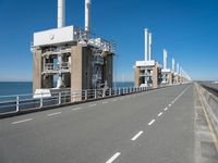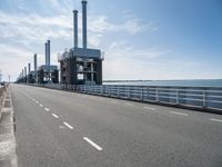 A composite view of the industrial infrastructure of Holland, including a modern architecture, highway, power station, lake, ocean, and more, against a clear sky and a parallel road surface.