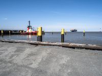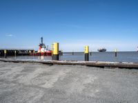 A view of the coastal city of Bremen, Germany, with a harbor, lake, beach, and industrial structures, including a bridge, a boat, and a pier, on a clear day. Rolling factories and tar roads lead to a container port, while electricity and water resources flow throughout the open public spaces, shorelines, and woodlands. The landscape in Europe is a representation of art, tranquility, and energy.