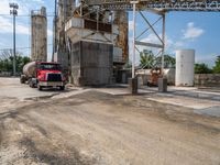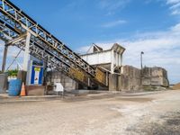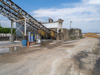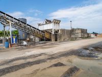 A view of an industrial manufacturing factory on a gravel surface with asphalt surrounding it. The factory stands tall under the cloudy sky on a sunny day. The dirt area nearby adds a rugged feel to the industrial setting.