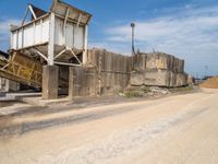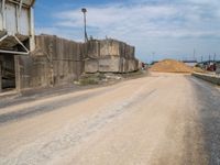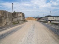 a gravel road with a large pile of dirt in the background and power lines going over the street