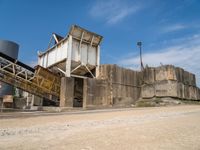 A view of an industrial manufacturing factory on a gravel surface on a cloudy day