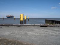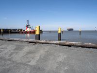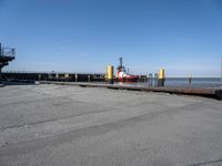 a harbor with cargo trucks parked beside it and one being unloaded by a boat