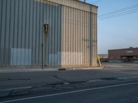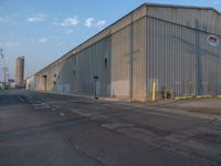 A storage depot, warehouse, and factory at the break of day in Salt Lake City, USA, with a dirt surface, vegetation, and hard shadows in the gravel area.