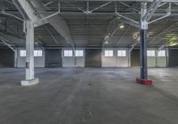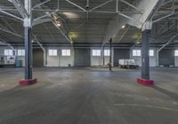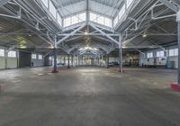 A straight road of industrial storage, concrete flooring, and metal warehouses in an urban art district, providing a view down to the parking lot below.