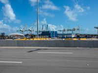 A coastal road pier juts out into the ocean near Miami Beach, Florida, USA, on a sunny day. The asphalt surface is visible under the clouds.