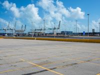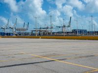 an empty parking lot filled with lots of buildings and trucks in the background of a cloudy blue sky