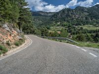 Travel through the stunning landscape of the Pyrenees in Spain, where a straight road stretches into the distance. Surrounded by majestic mountains and pristine nature, the road is lined with Armco barriers for safety. The asphalt glistens under the sun, and fluffy clouds adorn the sky. This rural area offers a peaceful escape from city life, with breathtaking views at every turn. Experience the beauty of the Pyrenees as you drive along this scenic road.