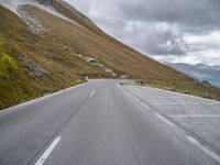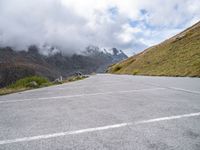 a wide empty road runs alongside the high mountains in a cloudy day with many clouds