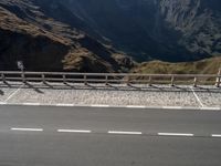 the motorcycle is traveling down the road near the mountains by itself on the side of the road