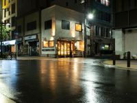 A storefront on a dark, wet road illuminated by artificial light in a busy city center.