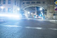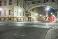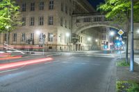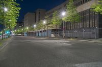 A classic and modern mix of architecture, urban design and infrastructure in Berlin, Germany, is illuminated by street lights and illuminated windows, providing a glimpse of the city at night. The trees, asphalt road and tar create a contrast of tints and shades in the residential area.