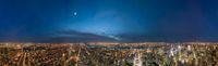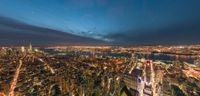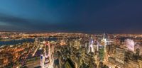 The sprawling city of Manhattan, New York, USA, is seen from a distance, illuminated by artificial light and the city's iconic skyline, with modern architecture and clouds in the sky dome at night.