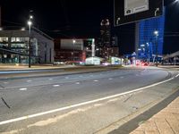 A view of modern architecture, skyscrapers and street lights in a busy business district of a Dutch city at night. The illuminated city shows off its urban design and electric lights, creating a unique atmosphere of life and business in Europe.