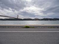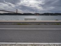 A scenic view of Lisbon, Portugal, featuring a cable-stayed bridge, a lake, a pier, and a cobblestone road, with a coastline and clear sky in the horizon. The calm lake reflects the sunny day and the mountain landforms in the background.