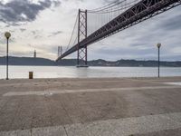 Break of day on the coastal landscape of Lisbon, Portugal. The panorama view showcases a tree-lined road with an asphalt surface, leading to a bridge, pier and lake. In the background, a hazy horizon of cumulus clouds, ocean and water resources are visible.