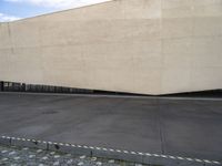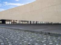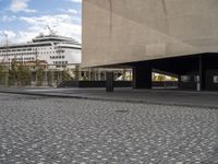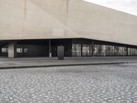 A modern office building in Lisbon, Portugal with its facade made of concrete, composite material, tar and brick, contrasting with the grey sky and the black-and-white tones of the cobble stone road surface at its ground.