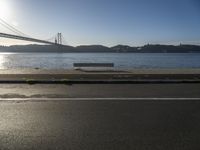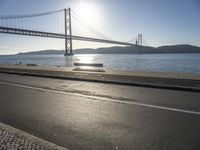 The sun rises over the coastal landscape of Lisbon, Portugal, illuminating the asphalt road, the bridge and underpass, the beach, the lake and pier, and the harbor. The clear sky and bright sunlight bring a sense of calm and recreation to the morning, as a bicycle is seen in the distance and the sun's afterglow gives the ocean and its resources a beautiful hue.