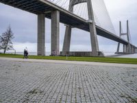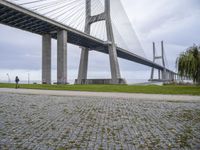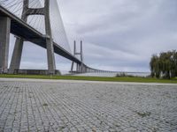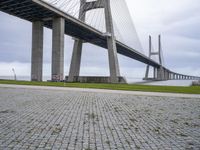 The cable-stayed bridge in Lisbon, Portugal, is a landmark of the city, representing the urban design and infrastructure of the region. Its composite material, nature, and grass make up its unique landscape, with a grey sky providing a gloomy backdrop for a morning view of the ocean and the open space.