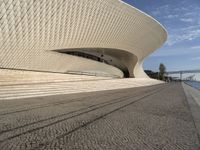 A clear sky day in Lisbon, Portugal reveals a modern urban design featuring a composite material facade, patterned road surface, asphalt and cobblestone, and a bicycle wheel fixture. Trees, a landmark tower, a wood art fixture, and a tar roof top design provide tints and shades to the city's skyline.
