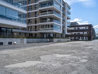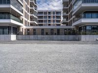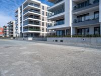 A residential area of Bremen, Germany is showcased, featuring a modern architecture comprised of a mix of materials like concrete, composite, and grass. The cityscape is illuminated by the clear sky, and the gravel road surface is surrounded by public spaces, office buildings, and condominiums.