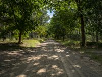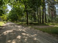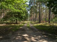 A winding dirt road stretches straight down through a lush forest landscape in Brandenburg, Germany, on a sunny day.