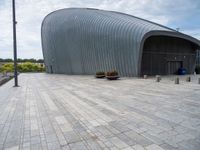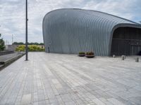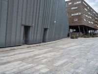 A black-and-white scene of a cityscape in the Netherlands, featuring a tire on the concrete road surface, a hotel, a restaurant, a residential area, a bridge, a tree, and a skyscraper in the background.