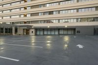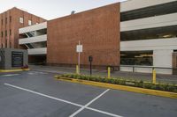 A modern high-rise condominium in the Los Angeles neighborhood of California, USA, with a brick facade, asphalt flooring, concrete curb, tree, and street light illuminated on a sunny day.