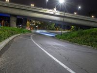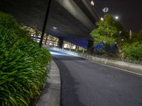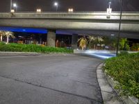 A cityscape of Los Angeles, USA, illuminated by artificial light at night, with a one quarter view of an asphalt road winding through the urban design.