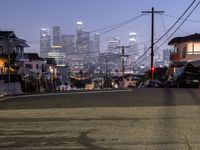 Discover the vibrant cityscape of Los Angeles, California, where residential areas blend seamlessly with urban landscapes under a clear sky. As night falls, the city is illuminated by artificial light, street lights casting a glow over asphalt roads and open spaces. The suburban charm of this USA city is enhanced by the urban profile, offering a unique perspective of city life after dark.