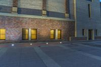 A view of a residential area in Los Angeles, California, USA at night. The beautifully lit houses and streets create a vibrant urban atmosphere with artificial lights casting a warm glow on the brick and stone walls.