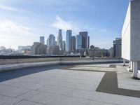 A breathtaking view of the Los Angeles skyline, showcasing the city's modern architecture and metropolitan area. The clear sky and sunny weather complement the high-rise buildings, skyscrapers, and condominiums. The urban design and open spaces offer a vibrant city life experience, with asphalt roads and parking decks providing convenience for residents and visitors alike.
