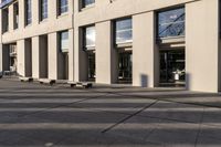 A stunning low angle view of the modern architecture in the bustling city of Wellington, New Zealand. The sleek and stylish building stands tall against the blue sky, showcasing its unique facade, large windows, and clean lines. The busy road below is lined with columns and shadows, adding depth to the urban landscape. The concrete surfaces and pavers on the curb reflect the business district's material property, creating a professional and bustling atmosphere.
