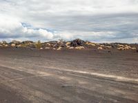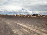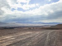 a view of the barren mountains and a dirt road in front of a cloudy sky