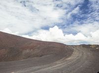 a man walking on a road with some gravel and some clouds in the sky and hills