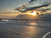 In the picturesque Balearic Islands of Majorca, the sun rises over the curved roads, casting a warm glow on the Armco barriers and asphalt. Clouds dot the sky as the sun becomes visible, illuminating the sunny landscape. The combination of break of day and sunshine creates a stunning profile against the European backdrop, offering a quarter of the day filled with beauty and tranquility.